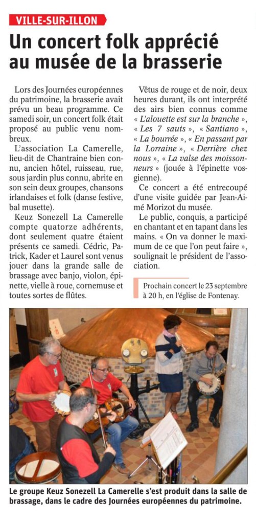 Pour la première fois, le musée, présentait un concert dans la grande salle de brassage. Les musiciens, le très nombreux public ont apprécié de se retrouver dans ce lieu magique à l’acoustique parfaite. Keuz Sonezell a interprété des vieux morceaux de folk et de folklore, faisant valser les spectateurs. Une expérience à renouveler pour les futurs concerts.