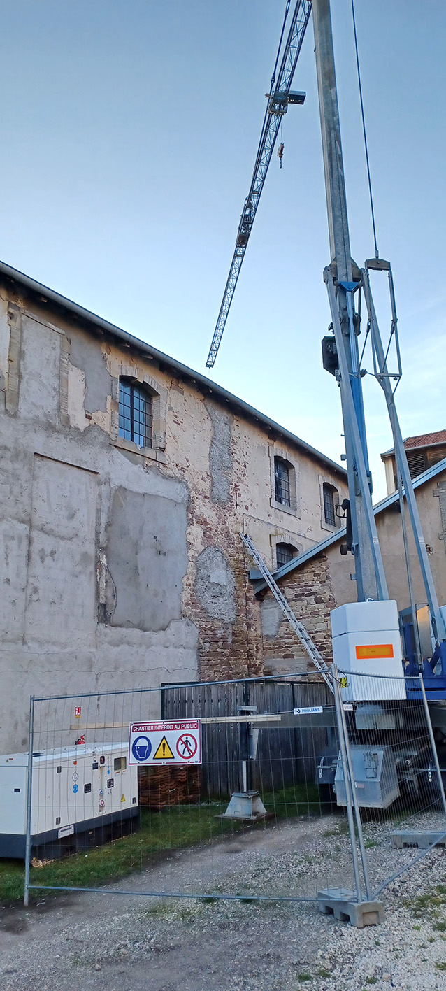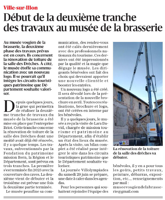 Depuis quelques jours la grue qui permettra de réaliser les travaux de la tranche deux a été mise en place par l’entreprise BRIOT. La tranche deux concerne la rénovation de toiture de la salle des drêches dont une moitié avait déjà été rénovée, il y quelques temps déjà. Les travaux, subventionnés par la fondation du patrimoine mission BERN, la région GRAND EST et le département des VOSGES sont prévus en trois tranches. La première a été terminée fin 2023 avec la couverture des caves, la deuxième débute, faisant l’objet d’un article dans l’édition du mardi 23 mars de Vosges Matin (ci-dessous) et la troisième est prévue après la fin de la tranche deux.