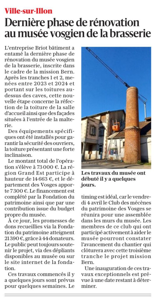 L’entreprise BRIOT BÂTIMENT est à pied d’œuvre pour la réalisation des travaux au musée vosgien de la brasserie. Entamés en 2023 et 2024 par les tranches 1 et 2, avec les toitures au dessus des caves, la dernière tranche prévue dans le cadre de la mission BERN est lancée. La rénovation pour cette tranche concerne la toiture au dessus de la salle d’accueil ainsi que les façades donnant sur l’entrée vers la malterie. Des engins spéciaux ont été mis en place afin d’assurer une sécurité maximum sur cette toiture très pentue.